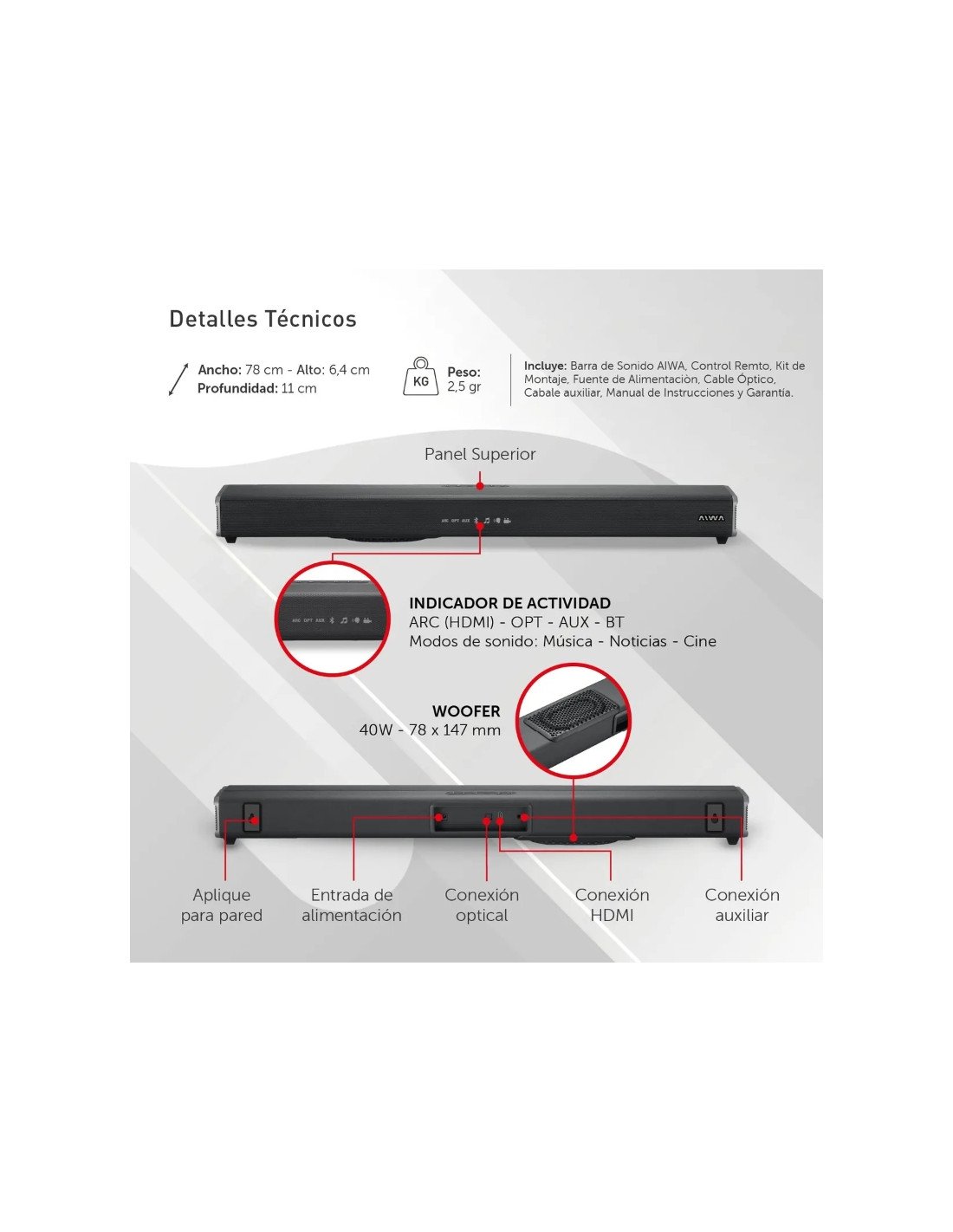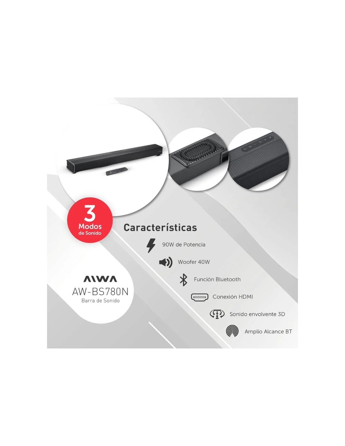La barra de sonido Aiwa AW-BS780N 1 woofer y 2 parlantes con una potencia total de 90 watts RMS. Además, ofrece un cómodo control remoto para poder controlar todo. Por otro lado, cuenta con conexiones HDMI, AUX, Audio Optico y Bluetooth. A su vez, unos cómodos indicadores LED anuncian qué está pasando todo el tiempo.