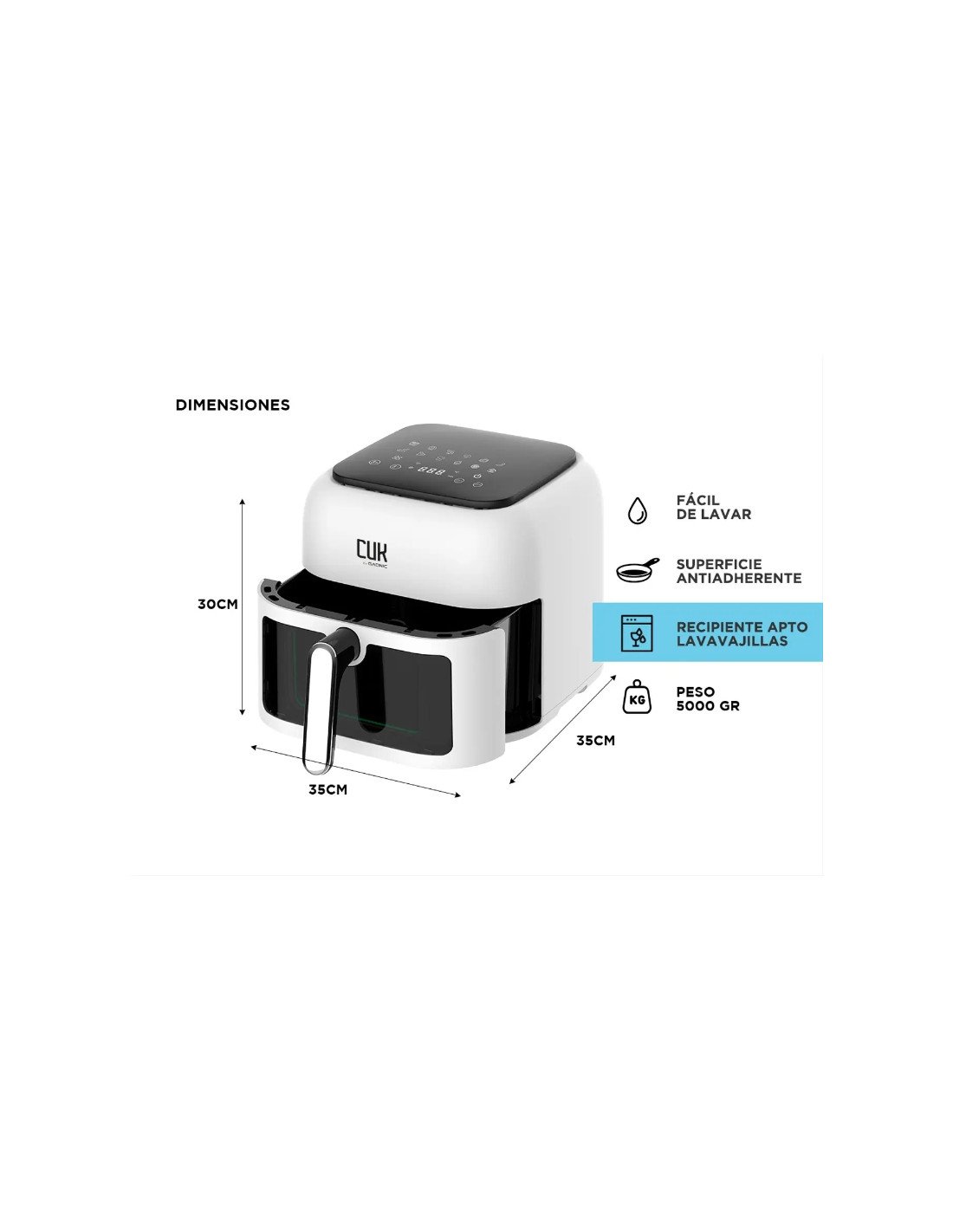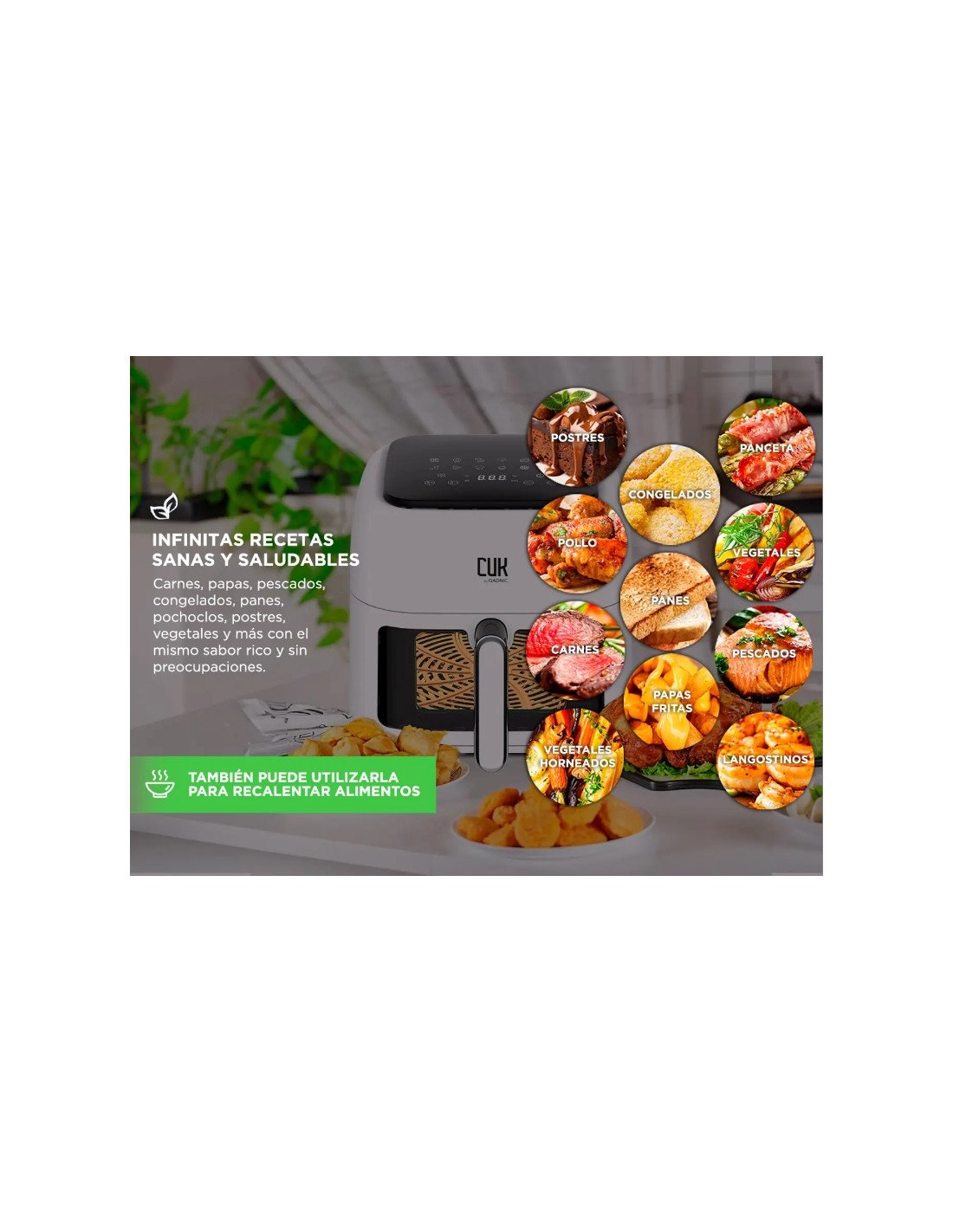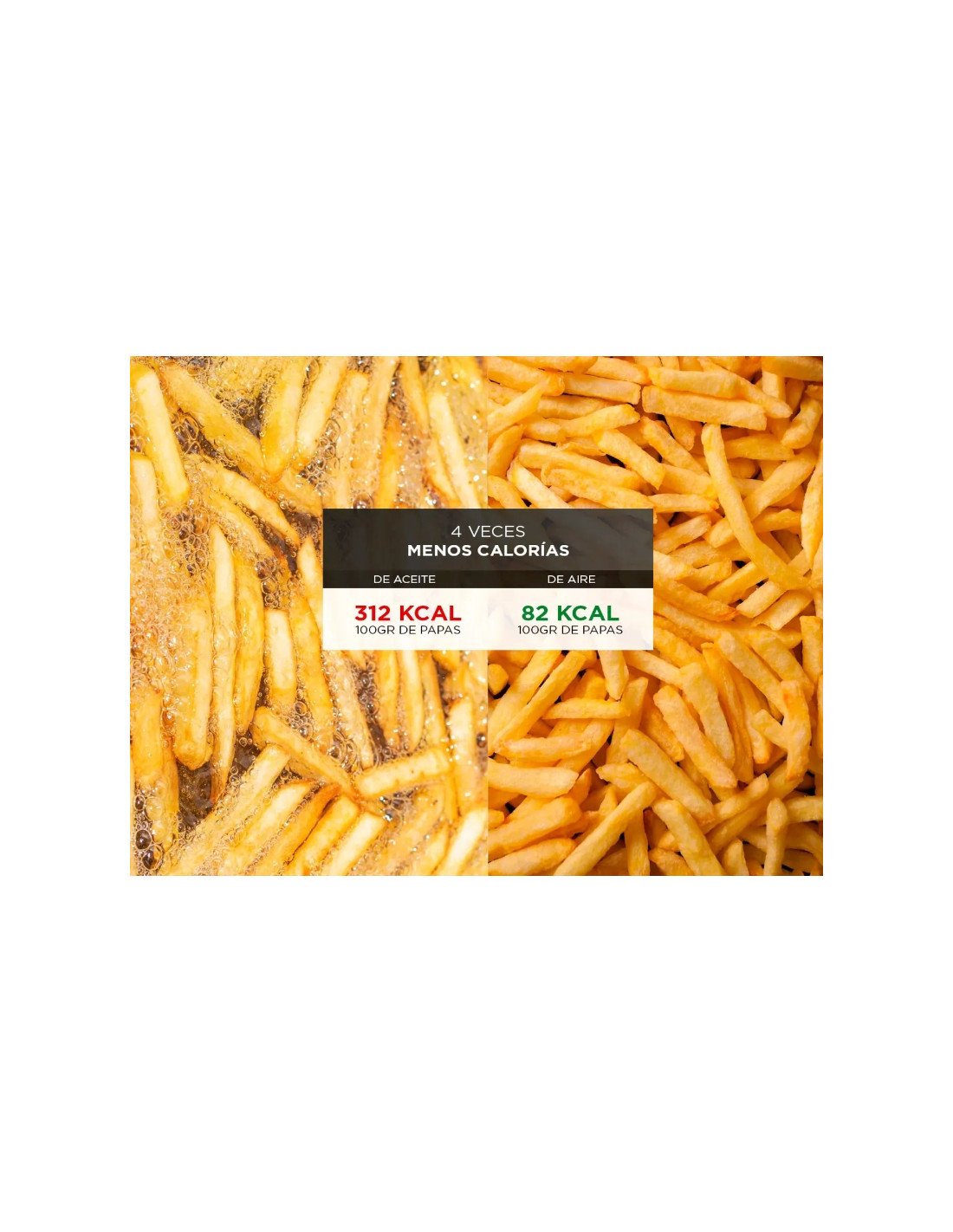 Con una capacidad generosa de 6,5 litros, esta freidora se adapta a porciones familiares y una amplia variedad de alimentos. Desde papas fritas crujientes hasta jugosas alitas de pollo, podrás satisfacer tus antojos con facilidad. Su pantalla digital y controles precisos te permiten ajustar la temperatura y el tiempo de cocción con facilidad, asegurando resultados perfectos en cada receta.