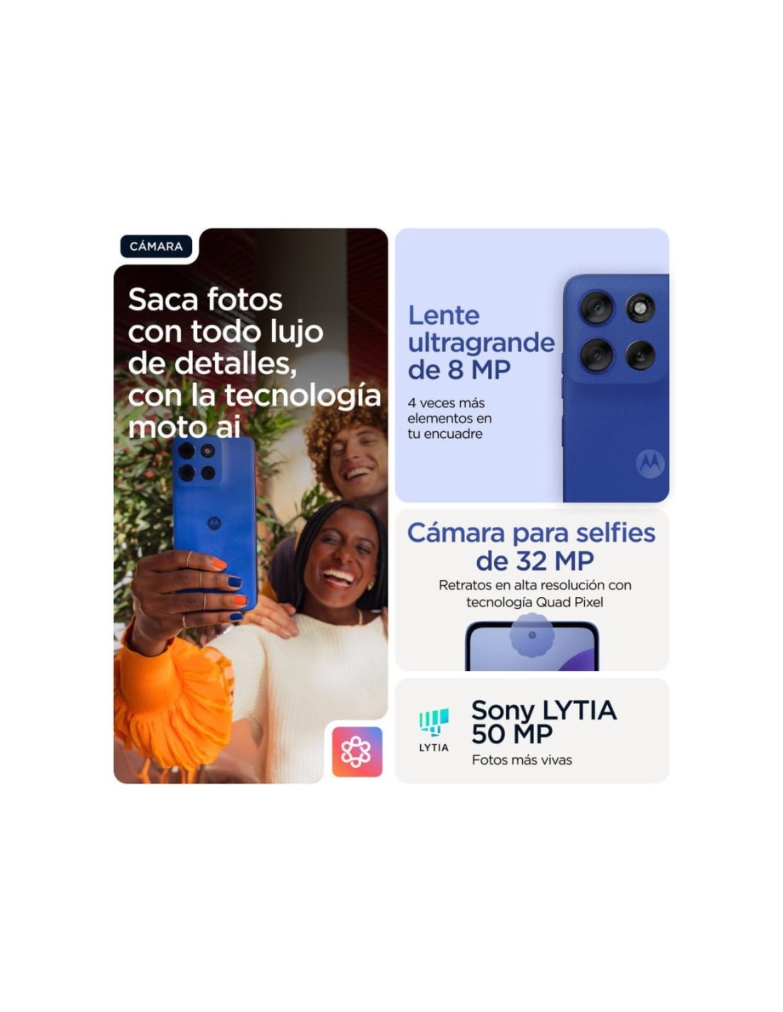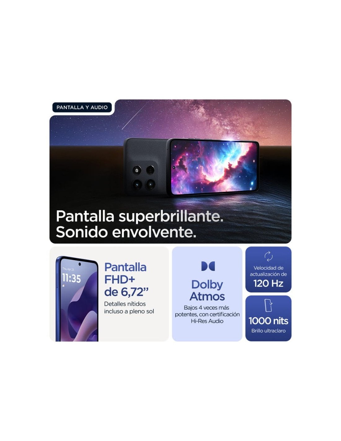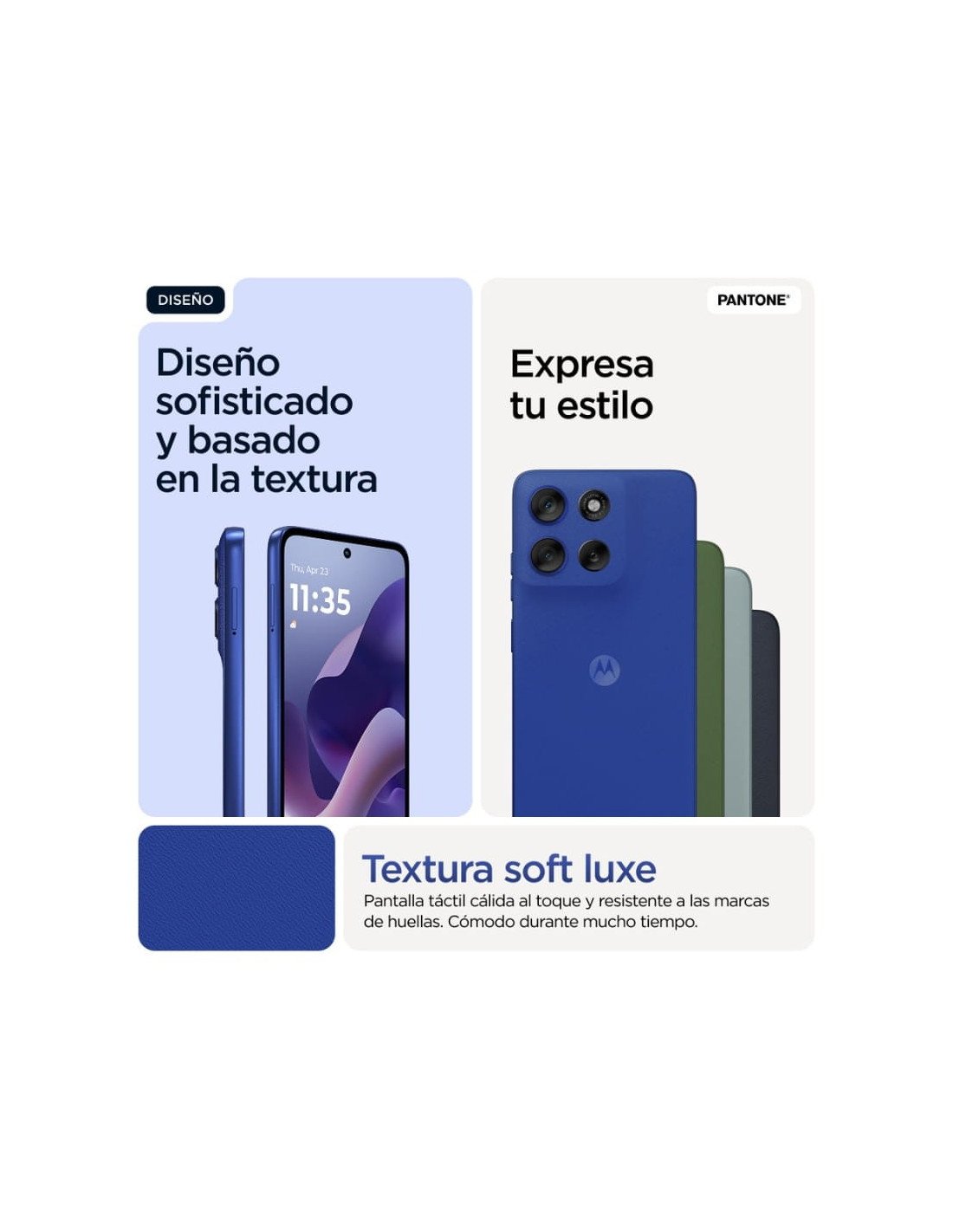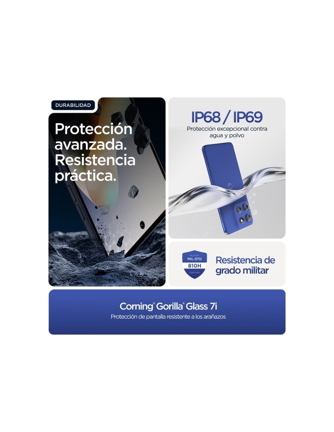El Moto G56 viene con un acabado sumamente cómodo y suave en la parte trasera que soporta el desgaste sin perder su aspecto sofisticado. Además, posee resistencia de grado militar contra caídas de hasta 1,2 metros, temperaturas extremas y admite la inmersión en el agua, hasta 1,5 metros durante un máximo de 30 minutos.