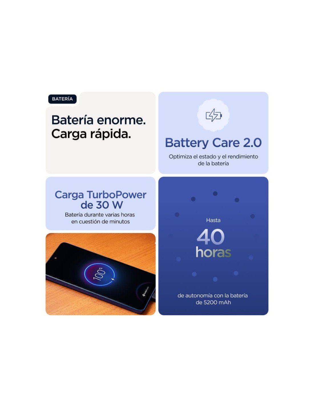 El consumo eficiente del procesador se combina con la gran capacidad de la batería para otorgar autonomía durante todo el día. Cuando lo necesites, cárgala en cuestión de minutos gracias a la carga TurboPower de 30W y vuelve a disfrutar de horas y horas de uso.