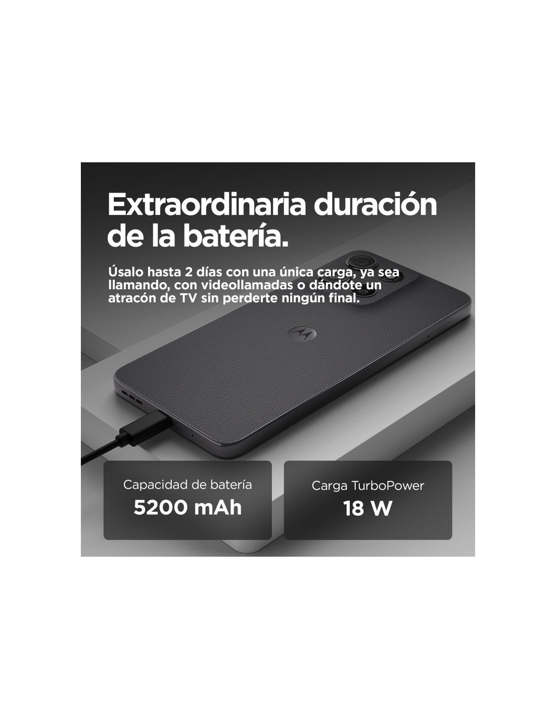 Alimentado por una extensa batería de 5200 mAh, el teléfono Motorola Moto G15 5G te garantiza un uso típico ininterrumpido de hasta 2 días con una sola carga. Después, vuelve a llenarla rápidamente con la carga TurboPower de 18 W.
