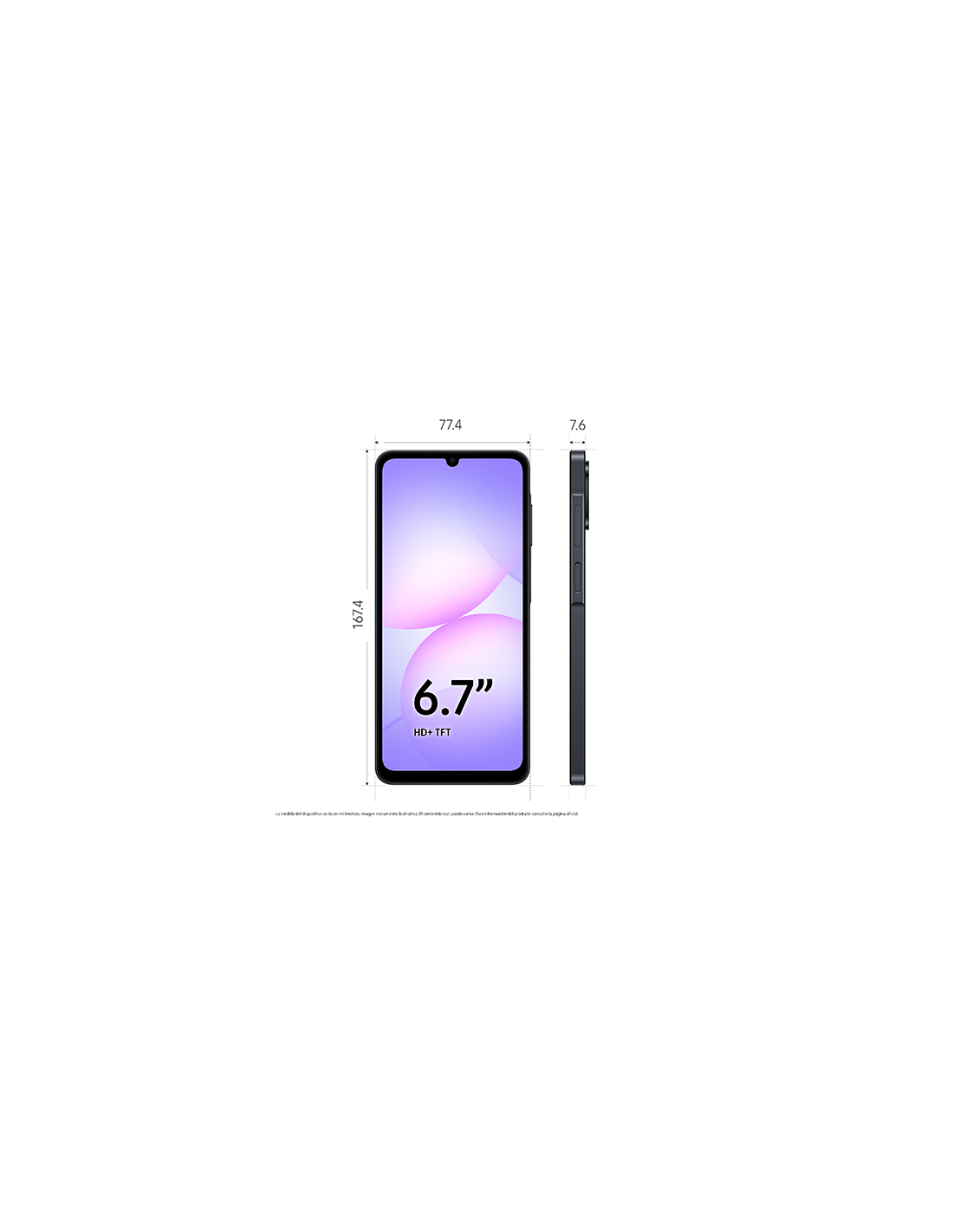 Mejorá tu experiencia móvil con el diseño delgado de 7,6mm del Galaxy A07, disponible en Black, Light Violet y Green.