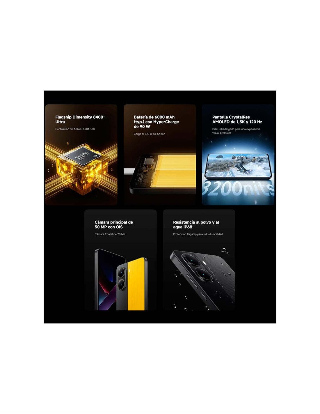 Poco X7 Pro con procesador Dimensity 8400-Ultra de 4nm. También presume de una amplia batería de 6000mAh con tecnología HyperCharge de 90W, así como de una pantalla CrystalRes AMOLED de 1,5K y una cámara Sony de 50MP. También cuenta con resistencia al polvo y al agua IP68.